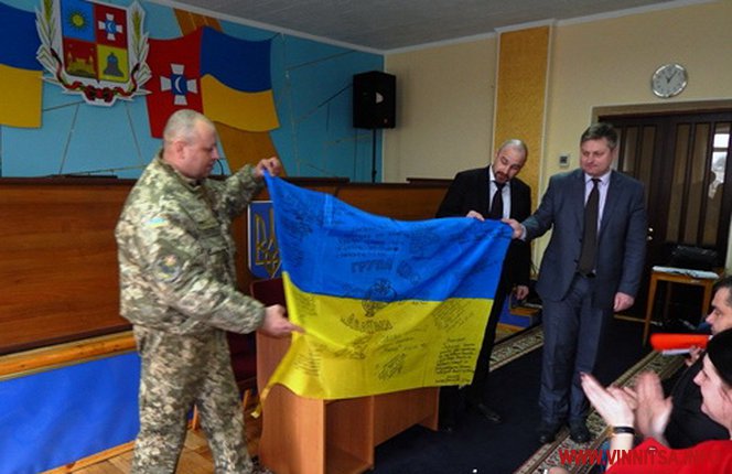 Військові передали національний стяг з надписами із фронту від вдячних солдат, котрі отримали зібрану громадянами провізію.