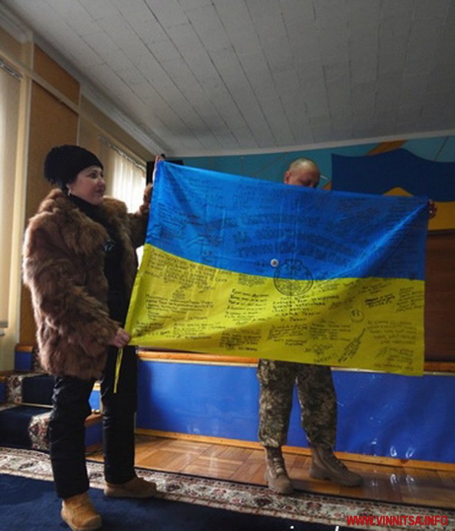 Аналогічний прапор-відповідь передали й Ометинецькій школі: ще минулого року діти долучились до акції «Зігрій хоробре серце», відправивши у зону АТО це жовто-блакитне полотно із надписами-посланнями захисникам, аби ті по-швидше повертались додому живими і здоровими. Прапор туди прийшов ще у вересні, побувавши на позиціях у Авдіївці, а тепер – знову повертається до Ометинець із дякою від передовиків.