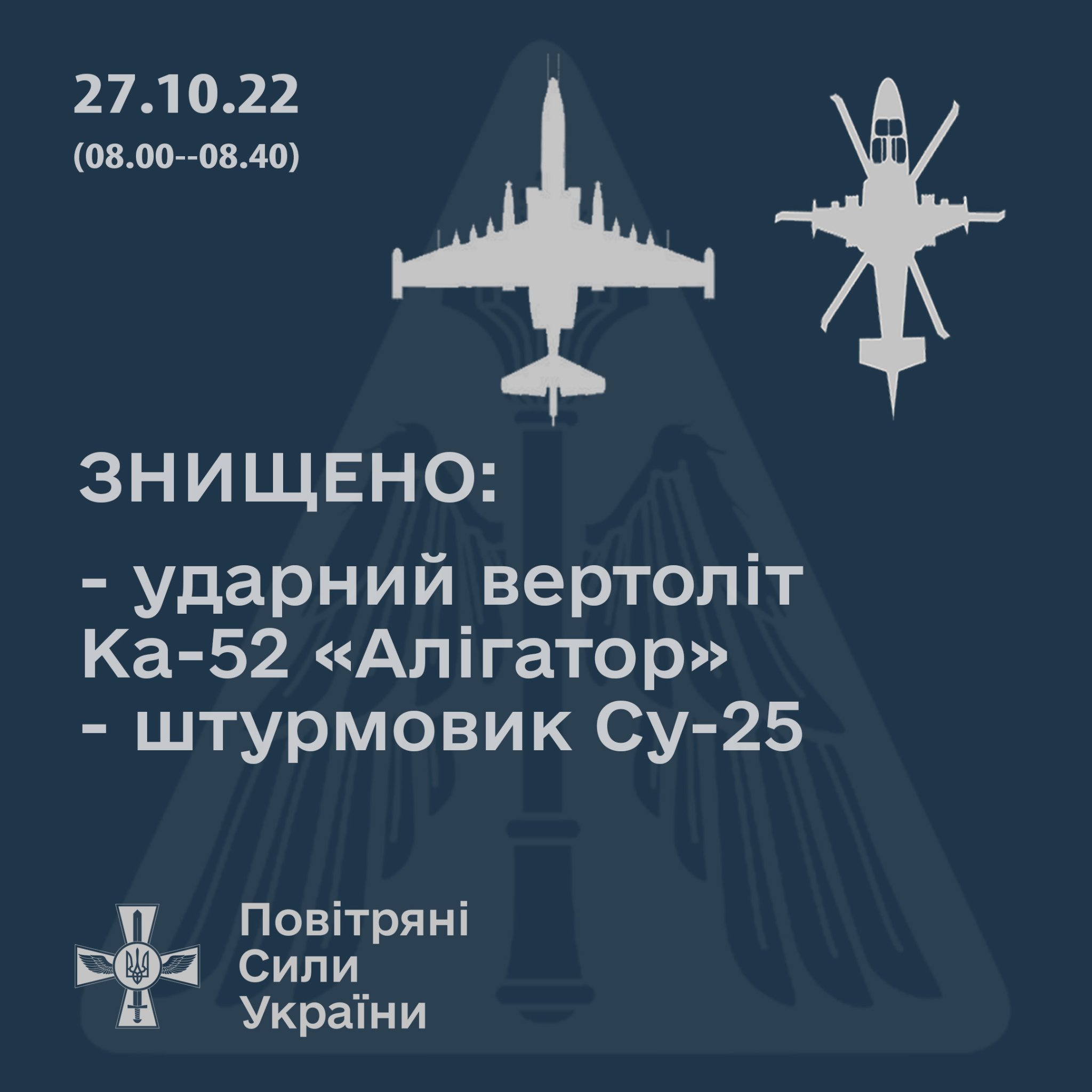 На Херсонщині 27 жовтня українськими військовими збито вертоліт ка-52 «алігатор» та штурмовик СУ-25.