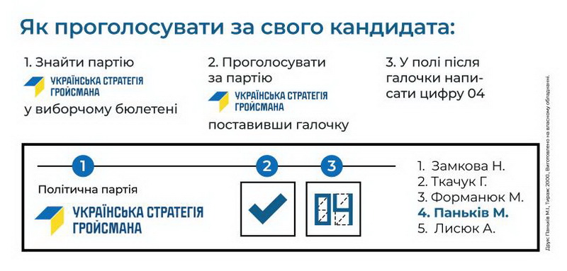 Паньків Михайло виборчий округ №9 до обласної ради: по правому березі річки Південний Буг міста Вінниці: від Пятничан, Кореї, Центру до Урожаю Вишеньки, Сабарова та Академічного. В бюлетені - партія «Українська Стратегія Гройсмана», Михайло Паньків під номером 4.