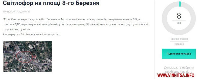 «Т-подібне перехрестя вулиць 8-го березня та Московської, являється надзвичайно аварійним. Кожних 2-3 дні стається ДТП, через неуважність водіїв, які рухаються у напрямку 3-ї лікарні, не пропускають авто, що рухаються зі сторони центру міста. А повернути з 3-ї лікарні взагалі катастрофа», – йдеться у петиції.