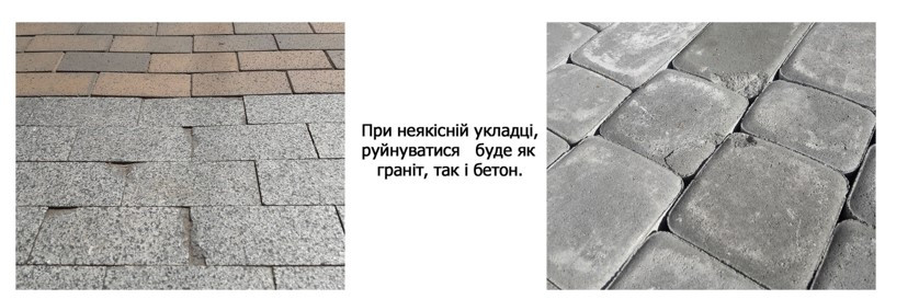 Взалежності від навантажень або рихлості грунту технічні умови змінюються. Та пам’ятайте, порушення технології мощення призводить до пошкодження бетонних елементів, нестабільності поверхні, швидкого зношення. Відповідальність за технологію укладки несе укладчик тротуарної плитки.