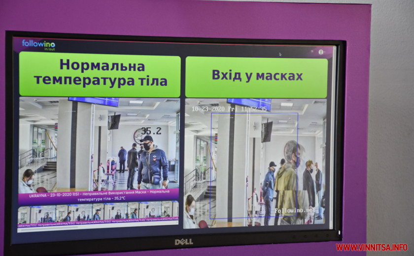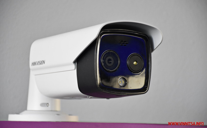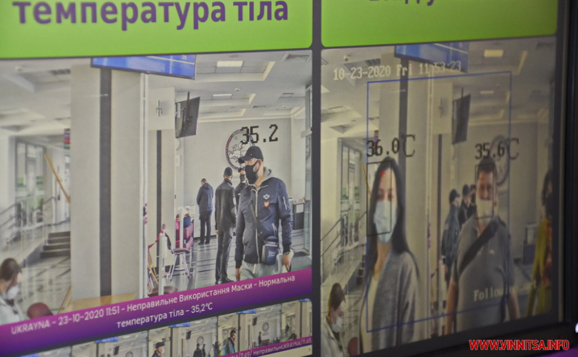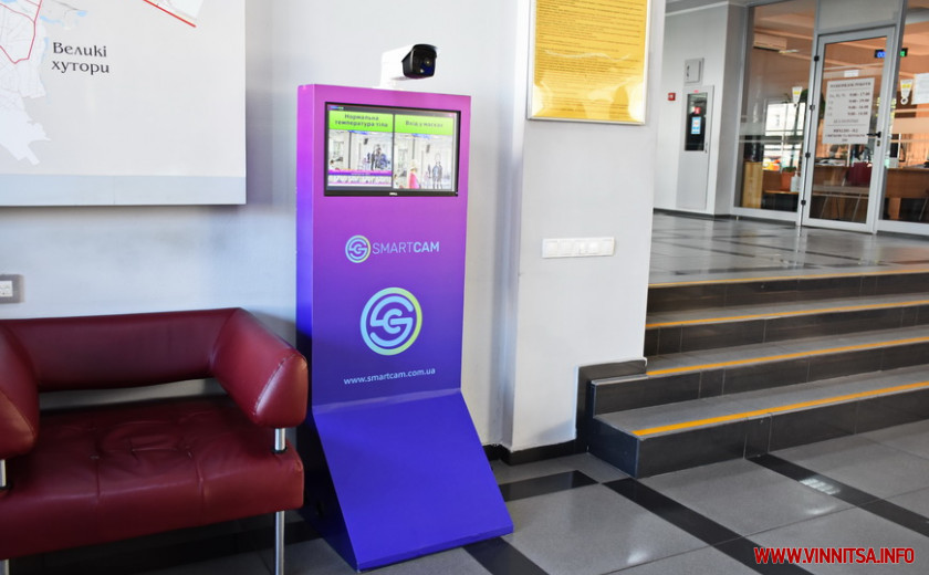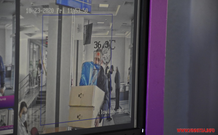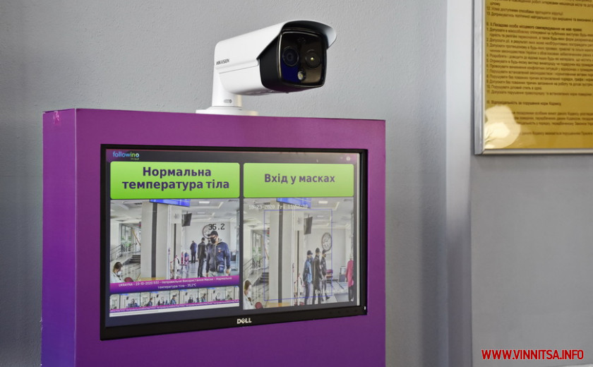 Днями у холі Вінницької міської ради встановили розумну смарт-камеру, яка вимірює температуру тіла людей і нагадує одягати маски.
