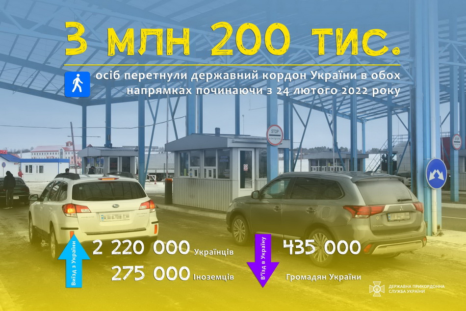 «Зокрема, з країни виїхало 2,2 млн наших земляків та 275 тис. іноземців. Нагадуємо, що в умовах гуманітарної кризи пріоритет пропуску на кордоні України надається жінкам та дітям.