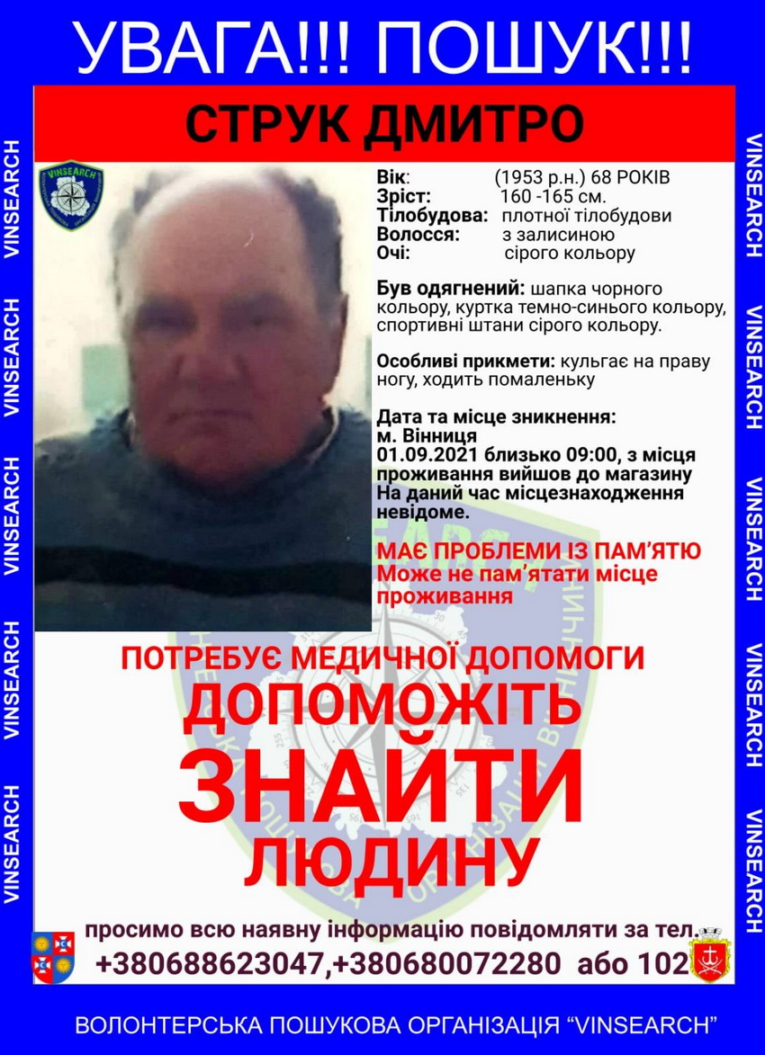 У Вінниці розшукують 68-річного Дмитра Струка. Той 1 вересня, близько 9 ранку, вийшов з дому, що по вулиці Заболотного у магазин, й досі не повернувся.Близькі зауважують, чоловік має проблеми із пам’яттю.