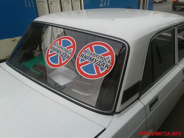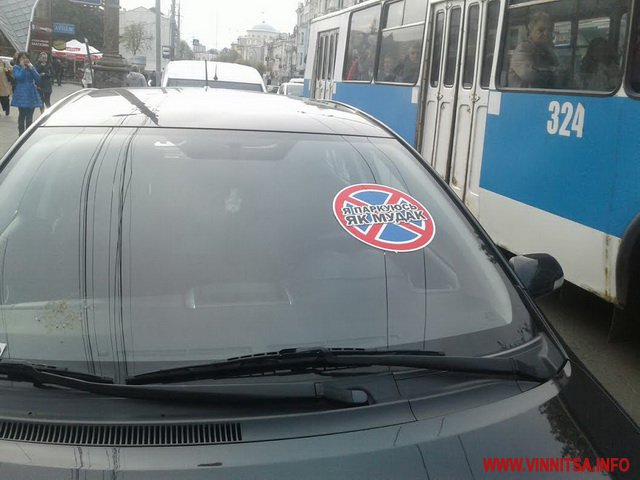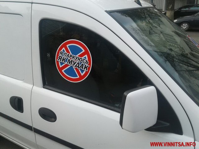 19 квітня у Вінниці на вулиці Соборній група активістів «карала» водіїв-правопорушників. Автомобілі, які були припарковані у заборонених місцях, затаврували наклейками «Я паркуюсь, як мудак». Не обійшлося без інцидентів.