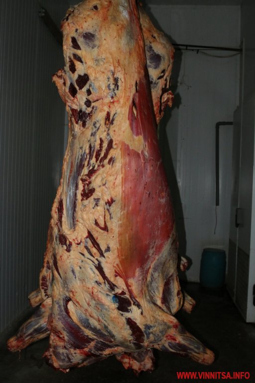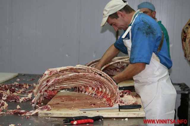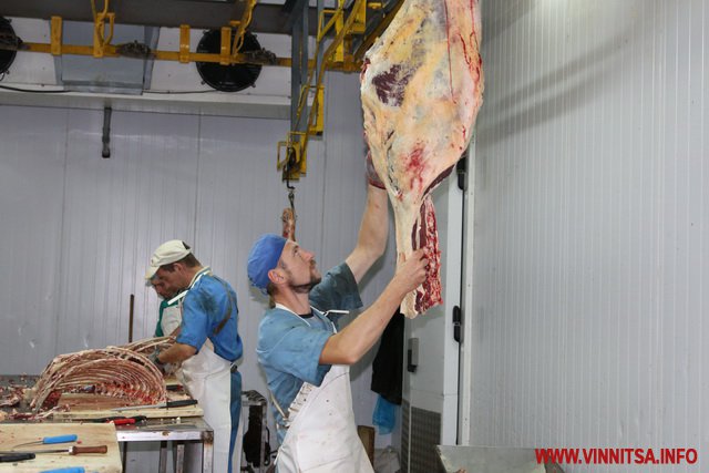 Проходимо далі - в обвалювальний відділ. Тут висять цілісні туші яловичини підготовлені до обвалки. Робітники розбирають їх по частинах. М’ясо відділяють від кісток, розділяючи на три сорти: перший, другий і вищий.
