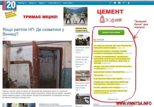 За яких кілька років сайт видання "20 хвилин", що входить до одного з найстаріших та свого часу найпотужніших вінницьких медіа-холдінгів "RIA", перетворися у "зливний бачок" для розповсюдження чорнушних матеріалів. Сталося це через появу на сайті рубрики "Новини читачів".