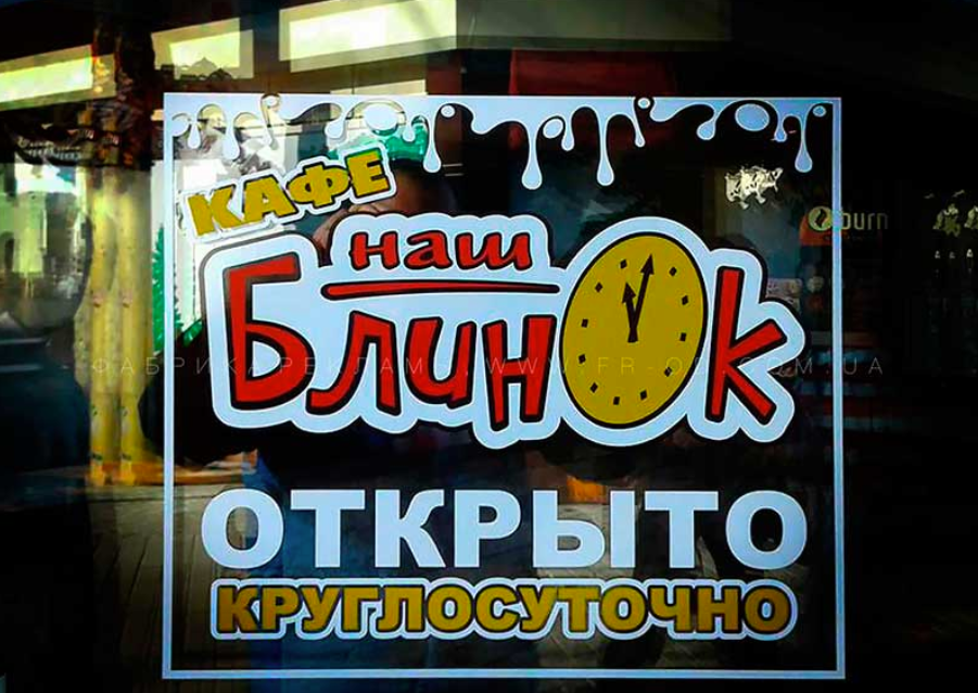 Також використовується друк із контурною підрізкою. Таке рішення добре поєднується з іншими аспектами оформлення вітрин, тому що дозволяє прикрасити лише певні фрагменти конструкції, ефективно виділяючи товари.