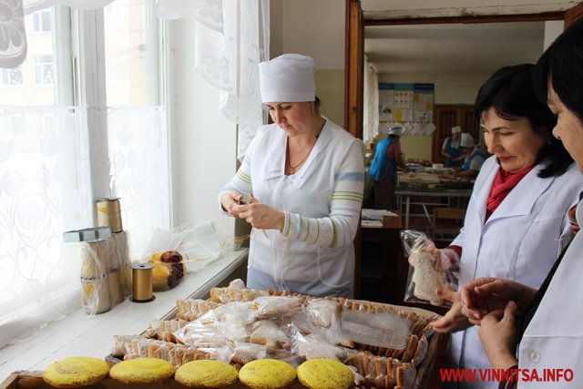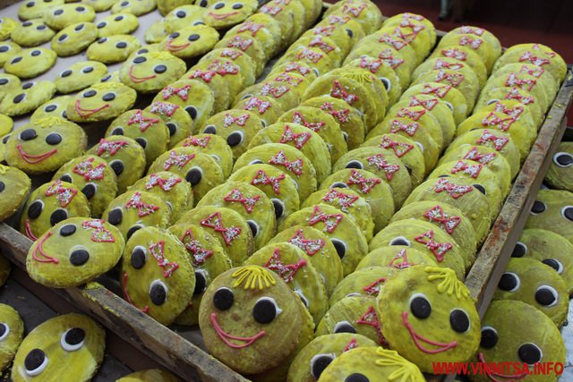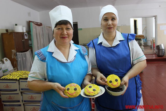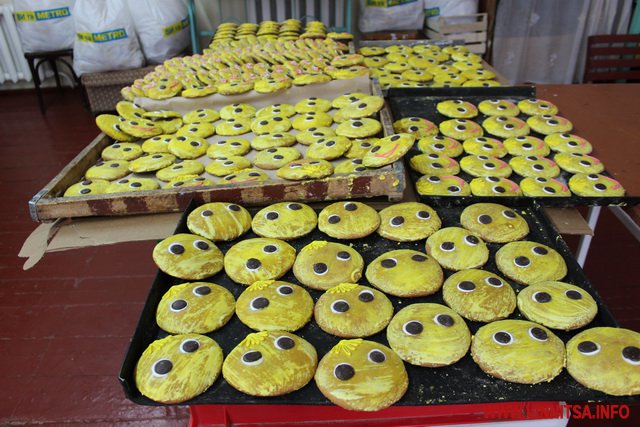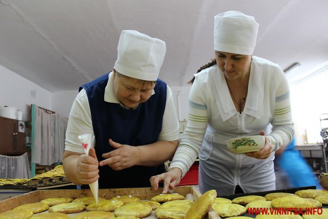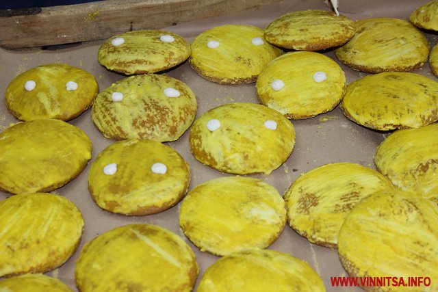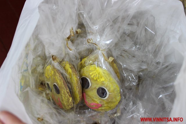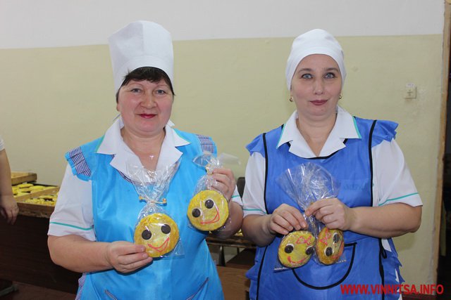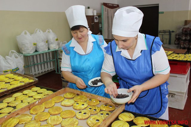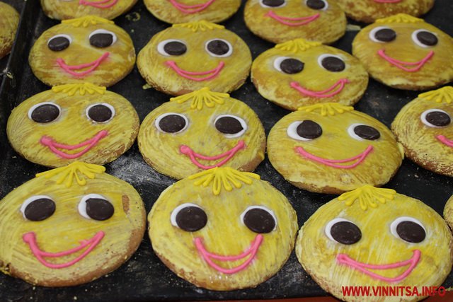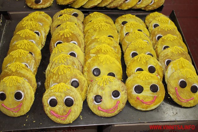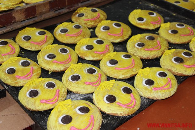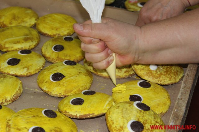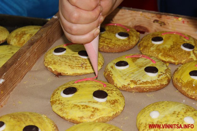 «Випікаємо ми печиво з натуральних продуктів, це яйця, цукор, мед, мука. Замішуємо тісто, потім формуємо круглою формочкою смайлик, випікаємо. Після випікання тиражним жовтим сиропом змащуємо печиво і потім вже замішуємо кольорову малювальну масу і розмальовуємо смайлики. Робимо ми смайликів дівчаток і хлопчиків. Хлопчикам малюємо чубчики, а дівчаткам бантики. Також випікаємо печиво у вигляді ялинки.