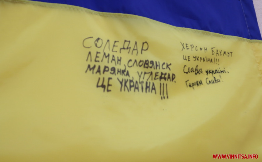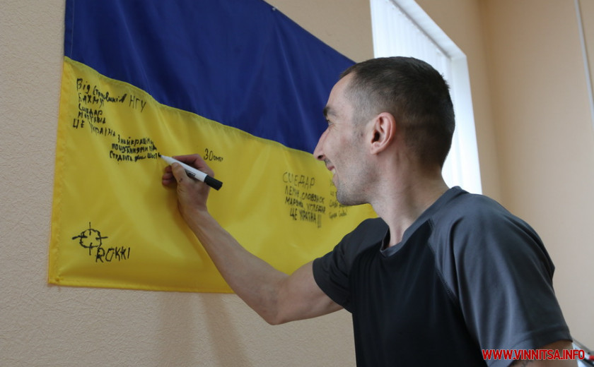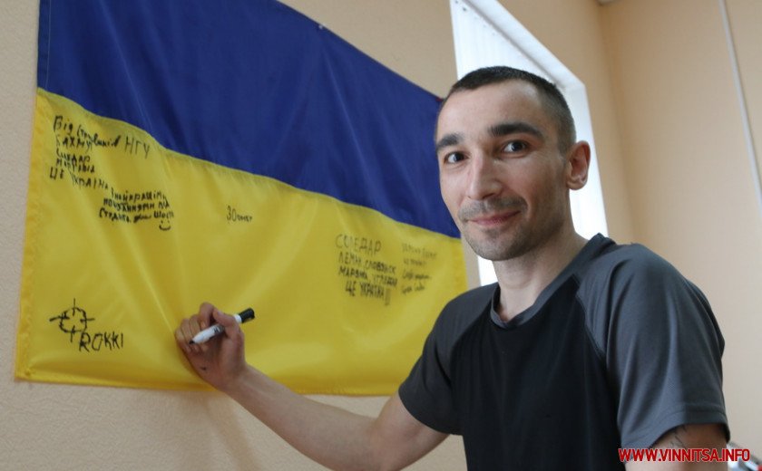 Військовий продемонстрував, як він встає із візка. Він підвівся, щоб підписати та залишити побажання на українському прапорі. Його до слова, медичному закладу подарували військові.