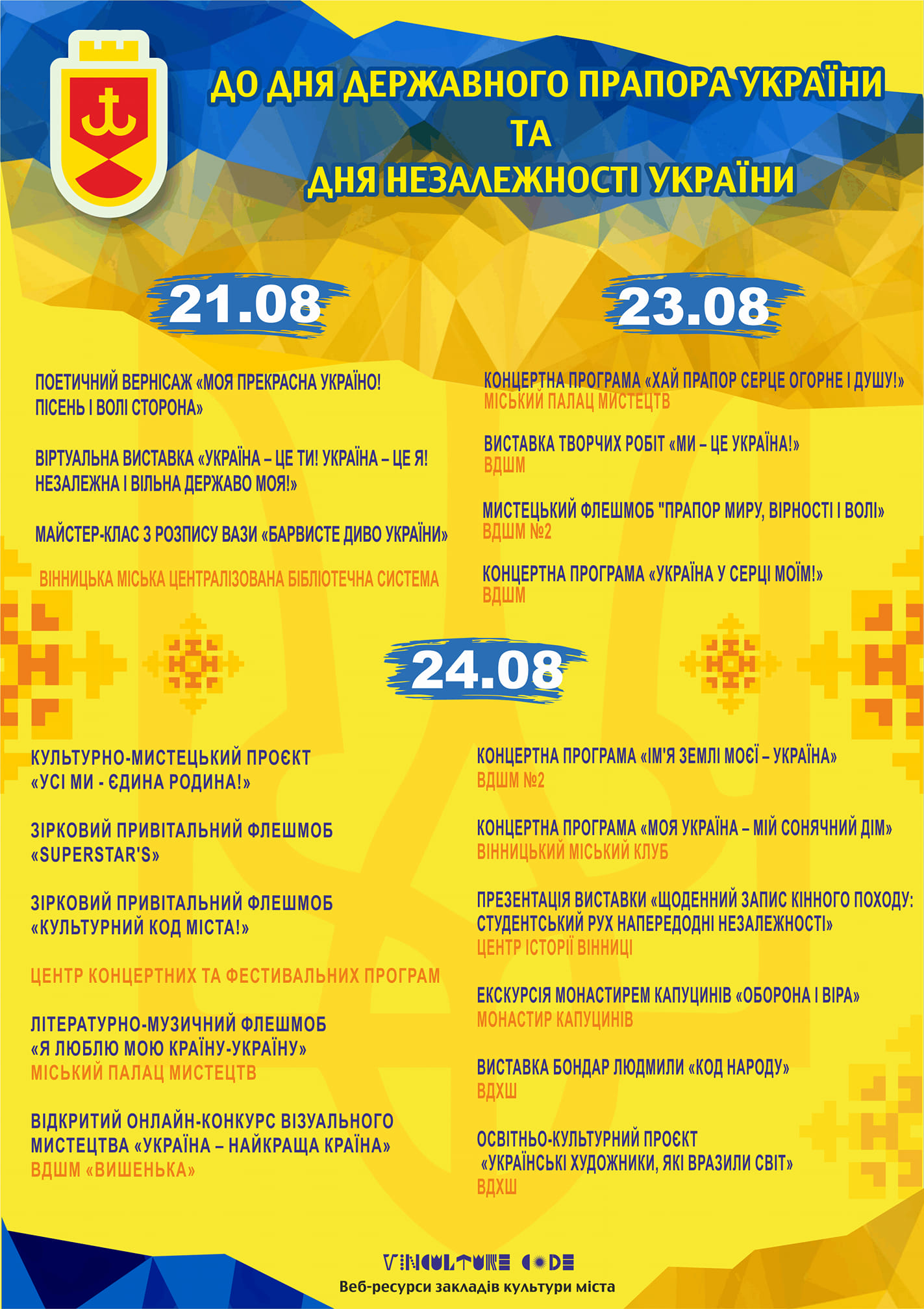 Також до Дня Незалежності та Дня Прапора України заклади культури проведуть ряд онлайн-заходів з 8:00 до 21:00 год. Їх можна буде подивитись на вебресурсах цих закладів та на сторінці VinCulture Code у фейсбуці в зазначені дні. Серед них – виставки, поетичний вернісаж, флешмоби, онлайн-конкурс тощо.