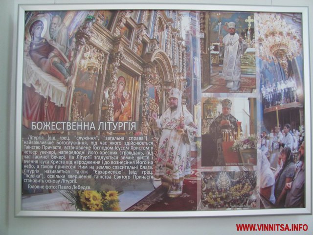 Усі фото розділені по темам у 27 великих панно з коментарями: «Лядівський монастир», «Лемешівський монастир», «Священики», «Монашество», «Люди церкви», «Діти і віра», «Будівництво храмів», «Божественна літургія», «Освячення», «Церковні таїнства», «Молитва», «Ікона», «Долина хрестів», «Хресна хода», «Калинівське диво», «Помилуй мене, Боже, з великої милости твоєї (псалом 50)», «Хресна хода по воді», «Водохреща», «Масляна», «Свято», «Дозвілля», «Мала батьківщина», «Православні храми», «Храм - небо на землі», «Кафедральний собор». Два стенди присвячено Блаженнішому митрополиту Володимиру та його гостинам у Вінниці. Адже митрополит неодноразово відвідував місто над Бугом, а востаннє був у Вінниці 4 листопада 2012 року, коли очолив божественну літургію у Спасо-Преображенському кафедральному соборі з нагоди 50-річчя митрополита Симеона.