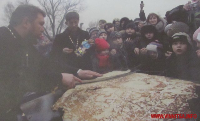 О. Сергій козацькою шаблею розрізає велетенський млинець (фото: Павло Багмут)