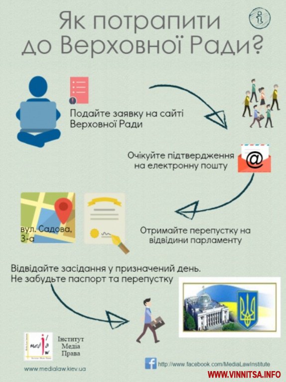 Наступний крок - отримати гостьову іменну перепустку на відвідини парламенту. Перепустки видаються безоплатно у бюро перепусток за адресою: м. Київ, вул. Садова, 3-а. Для отримання перепустки потрібно мати із собою документ, що посвідчує особу.