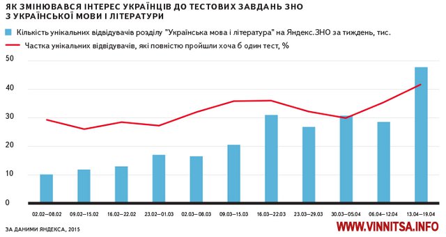 Зовнішнє незалежне оцінювання з української мови і літератури цього року проходять понад 11 тисяч випускників середніх шкіл з Вінниччини. За тиждень до тестування, розділ сервісу Яндекс.ЗНО, у якому зібрано пробні завдання і тести минулих років із цих предметів, відвідали близько тисячі вінничан.