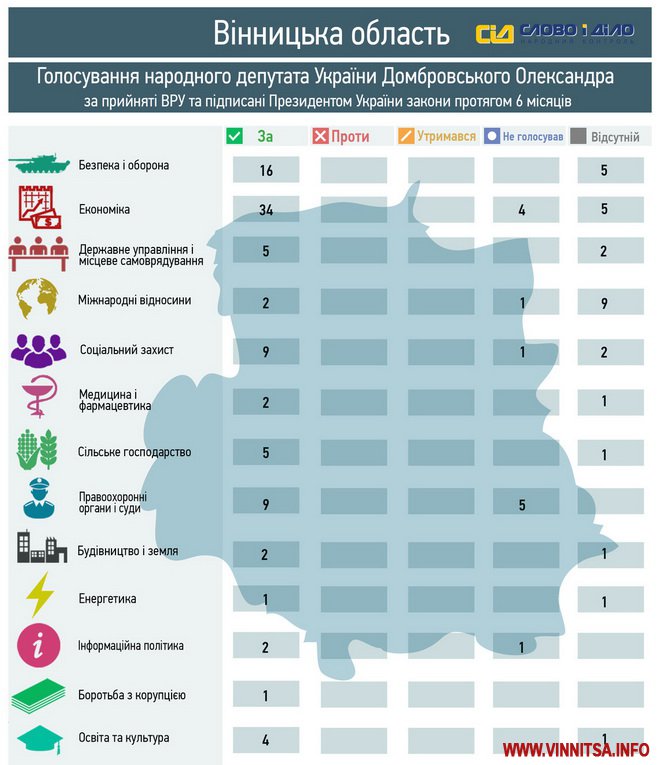 Загалом же, оцінюючи статистику відсутності або ж неголосування нардепів від Вінниччини за ключові закони України, які парламент ухвалював у другому читанні та в цілому, слід відзначити, що найчастіше до практики уникненя голосування вдавалися нардепи Олексій Домбровський (9 раз був відсутній у ході голосувань за закони, що стосуються міжнародної політики, 5 разів – у ході голосування за економічні та безпекові ініціативи), Юрій Македон (пропустив 5 голосувань з безпекових та економічних законів), а також Петро Юрчишин і Олексій Порошенко. Юрчишин запам'ятався тим, що 8 разів не голосував з невідомих причин за закони щодо міжнародної політики, а Порошенко у 5 випадках не голосував за ключові економічні закони та 5 разів був взагалі відсутній у ході голосувань у другому читанні за закони про правоохоронні органи та суди.