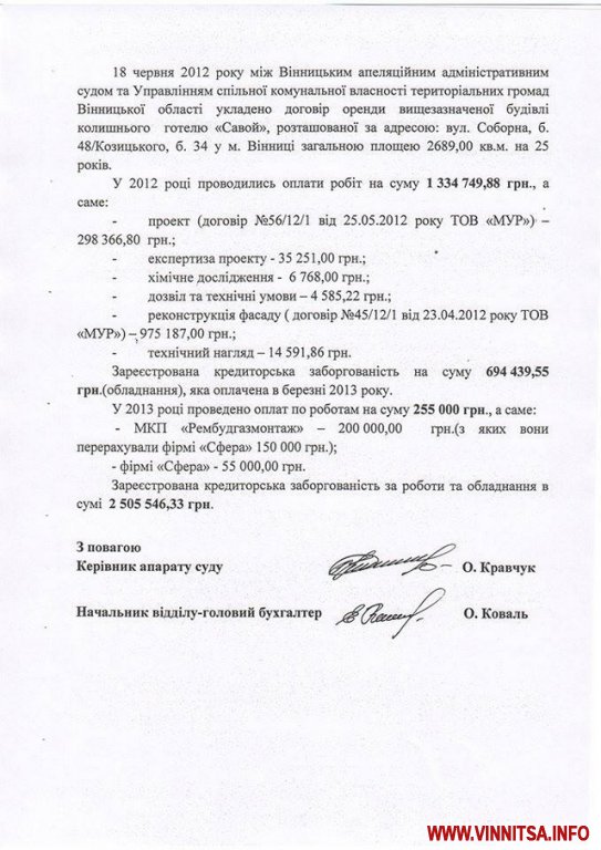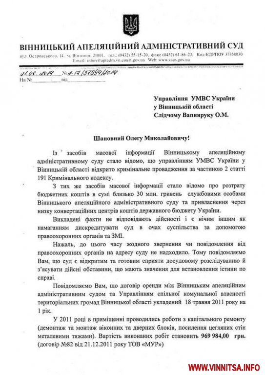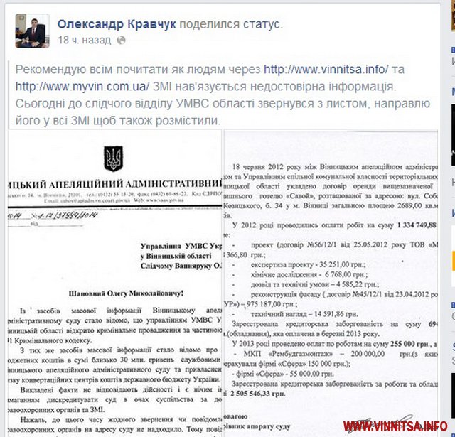 Спочатку у Фейсбуці з’явились "гнівні листи" від імені керівника апарату Вінницького апеляційного адмінісуду Олександра Кравчука, в яких ВИННИЦА.info та наших колег з сайту "Моя Вінниця" звинувачували у брехні та перекручуванні фактів (судячи зі всього, численні фотографії з будівлі, від яких стає моторошно, на суддів аж ніяк не вплинули).