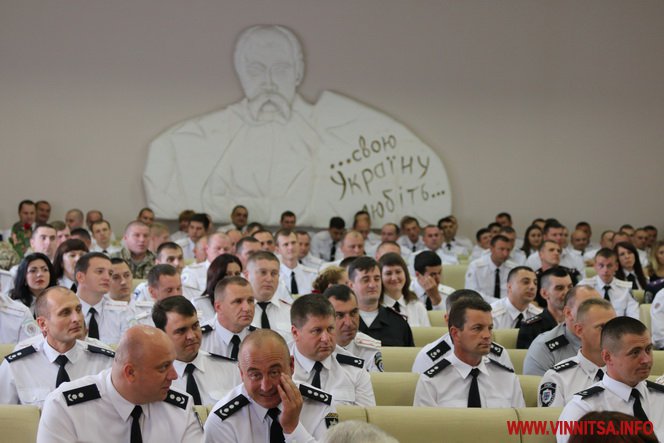 В актовій залі зібралися переатестовані працівники органів внутрішній справ, сьогодні вони вдягли нову форму білого кольору. Першим слово мав тимчасово виконуючий обов’язки начальника ГУ НП Вінниччини Юрій Педос.