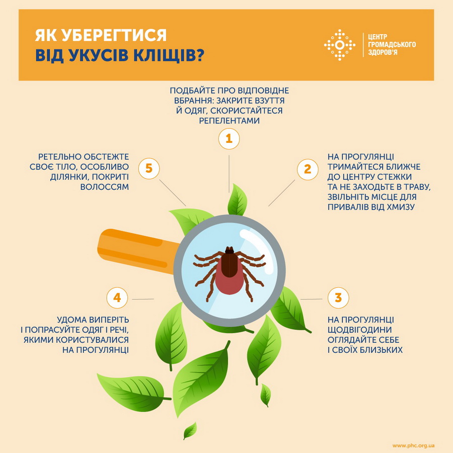 Протягом трьох тижнів після укусу кліща спостерігайте за своїм станом: щоденно вимірюйте температуру тіла, а в разі її підвищення чи почервоніння на шкірі, яке продовжує збільшуватися, – негайно зверніться до лікаря.