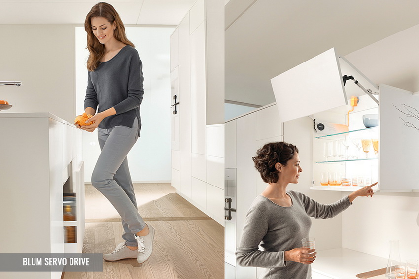 Відкривати і закривати фасади можна легким натиском. Електрична система відкривання від BLUM Servo drive дозволяє створити кухню майбутнього у вас вдома. Щоб опустити верхній фасад, достатньо натиснути на кнопку. Щоб закрити шухляду, легенько торкніться рукою, і вони засуваються автоматично.