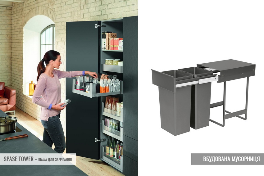 Цілком недорого можна придбати смітники з можливістю сортування відходів. Ви, одночасно відкриваючи фасад, висуваєте смітник, і, не промахнувшись, долонею змахуєте сміття прямо зі стільниці. Мрія перфекціоніста!