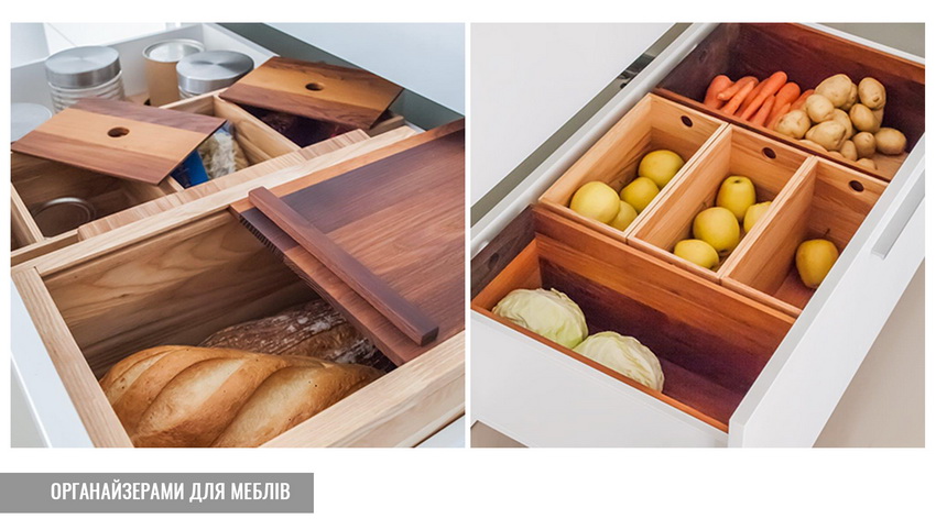 Внутрішня організація простору – це ціла філософія. Кухонні дрібниці - зовсім не дрібниці, якщо їх створюють професіонали. В Україні є компанія, яка займається виключно органайзерами для меблів - ERGOBOX. Контейнери створюють з натуральної деревини - масиву ясена. Їх обробляють натуральною рослинною олією та бджолиним воском. Особливо радісно, що цей прекрасний якісний продукт - український! У них можна обрати розділювачі для столових приладів, каструль, кришок, вбудовані хлібниці. Як альтернативу, звісно ж, не забуваймо про аксесуари Blum.