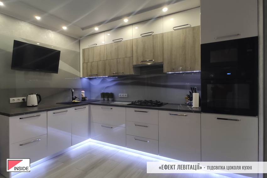 Ефекту кухні, що левітує, можна досягти освітленням цоколя. Особливо гарно це виглядає увечері. Ввімкнувши підсвітку, складається враження, що кухня зависає в повітрі - левітує. До речі, якість світла достатня, щоб заварити собі чаю, не вмикаючи основне освітлення.