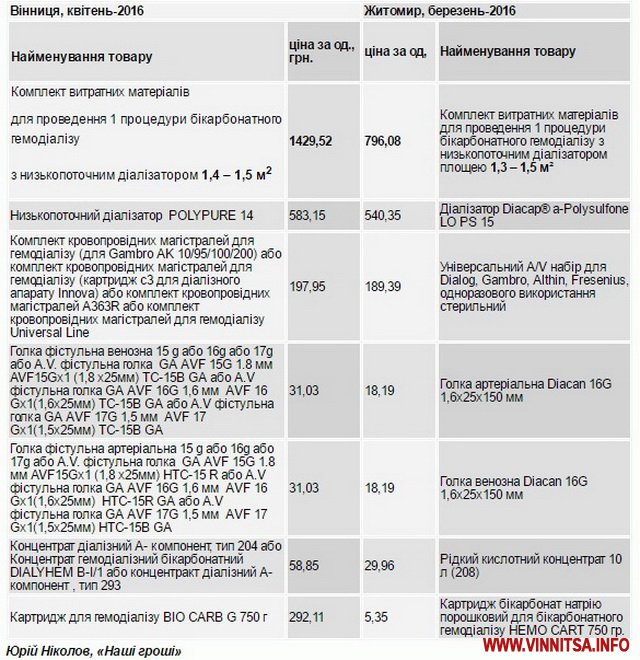Зрештою ціни на подібні за параметрами комплектами для лікарень Житомирщини на конкурентному тендері виявились майже вдвічі меншими від ціни вінницького тендеру (див. таблицю нижче).