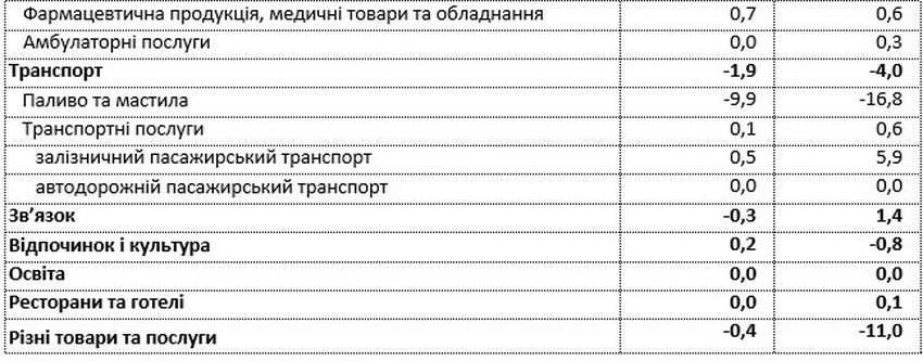 Ціни на транспорт знизилися на 1,9% в основному через здешевлення палива і мастил на 9,9%. Водночас на 2,7% подорожчали автомобілі.