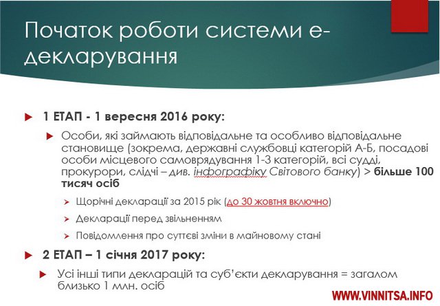 Зараз в Україні завершено перший етап подачі електронних декларацій президент, під час якого прозвітували прем’єр, члени уряду, депутати, судді, правоохоронці. За даними сайту Єдиного державного реєстру декларацій, на час завершення першого етапу документи подали понад 118 тисяч осіб. З 1 січня 2017 буде запущено новий етап - електронні декларації подаватимуть всі чиновники і керівники державних та комунальних підприємств.