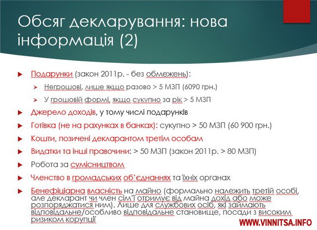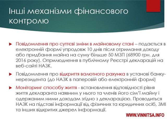 Проте, якби я показав, що я їх отримав подарунком в 2015 році, тоді я б одразу була заява про злочин в Антикорупційне бюро – хай розбираються. Проте якщо він, от зараз купляє щось на 100 тисяч доларів (більше, ніж 28 тисяч гривень, здається) він про це повідомляє впродовж 10 днів в цьому реєстрі, і з’являється повідомлення про зміну майнового стану. Так от, як тільки це повідомлення з’являється, до цього товариша іде Антикорупційне бюро (або буде заява) і питає: друже, а звідки у тебе 100 тисяч баксів? –Так я ж написав у декларації! –Е… те, що ти написав – це інша історія, доведи легальність цих грошей. І вже неважливо, коли ці гроші були здобуті! Правило 2015 року тут не діє, він має довести їх легальність. Якщо він це не доведе стаття за незаконне збагачення, до 10 з конфіскацією. Тому дуже важливо відслідковувати ці зміни майнового стану.