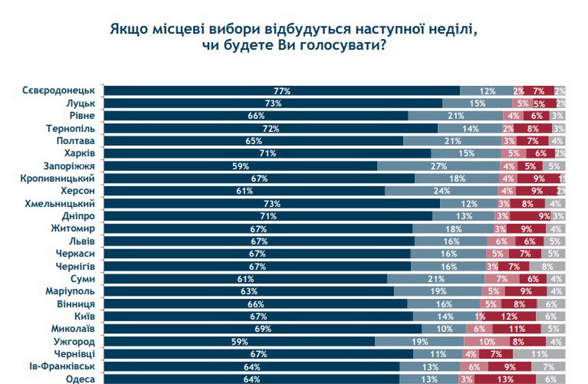 Зокрема, на запитання: якщо місцеві вибори відбудуться наступної неділі, чи будете Ви голосувати, однозначно так, відповіли 66% опитаних у Вінниці. 16% - скоріше так, 5% - скоріше ні, 8% - однозначно ні, ще 6% - важко відповісти.