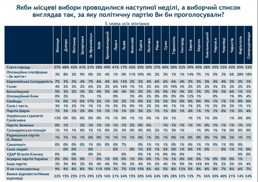 Також вінничанам поставили питання: якби місцеві вибори проводилися наступної неділі, а виборчий список виглядав так, за яку політичну партію Ви би проголосували? За результатами відповідей, найбільше – 27% проголосували б за Слугу Народу. На другому місці за рівнем підтримки вінничан Українська стратегія Гройсмана – 13%. На третьому місці – Європейська Солідарність – 7%. Батьківщина – 5%, Голос – 4% Сила і честь – 3%. Не змогли дати відповідь, за кого голосували б – 22%. 9% опитаних зазначили, що не будуть голосувати.