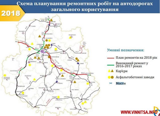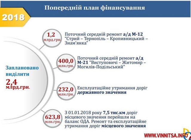 У 2018 році у Вінницькій області продовжать ремонт двох трас державного значення М-12 та М-21. На ці роботи, а також утримання інших доріг, з державного бюджету мають виділити близько 2 мільярдів гривень. Ще 623 мільйони має надати обласний бюджет, оскільки з нового року 7,5 тисяч кілометрів доріг перейшли на баланс ОДА. Левова частка коштів піде саме на М-12.