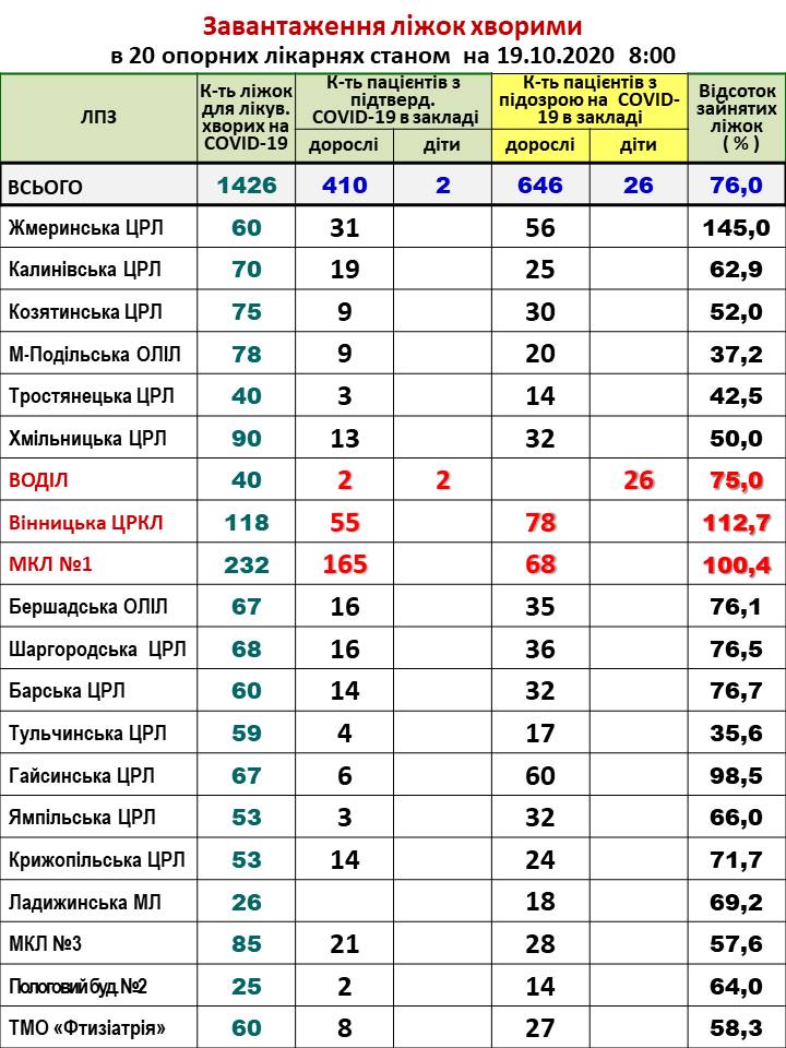 Найбільше завантажені три лікарні: Жмеринська центральна районна лікарня – 145%, Вінницька центральна районна клінічні лікарня – 112,7%, Міська клінічна лікарня №1 – 100,4%.
