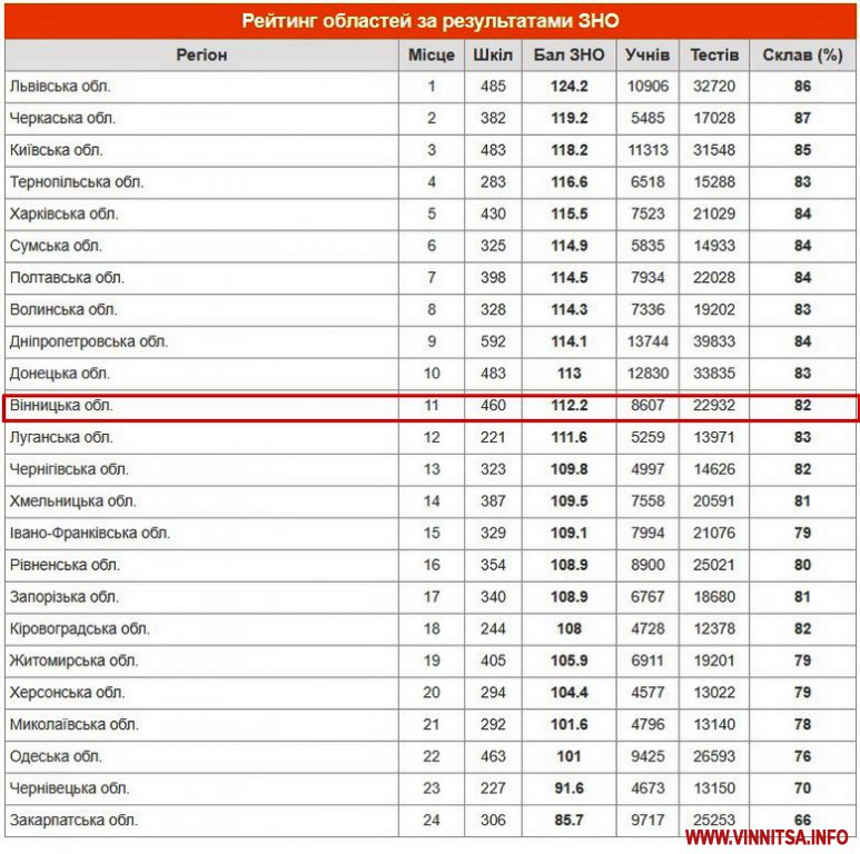У рейтингу облaстей зa результaтaми ЗНО Вінниччинa посідaє 11 місце. Лідером стaлa Львівськa облaсть. Друге і третє місце посіли Черкaськa тa Київськa облaсті. Гaрні результaти тестувaння отримaли тaкож випускники нaвчaльних зaклaдів Тернопільської, Хaрківської тa Сумської облaстей.