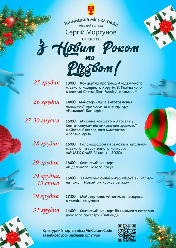 27-30 грудня о 16.00 всі бажаючі зможуть побачити музичне конфетті «В гостях у Санти-Клауса» від вихованців зразкової майстерні естрадного мистецтва «Зоряна мрія». 28 грудня о 16.00 стартує гала-марафон переможців загальноміського інтерактивного конкурсу «Music camp» Вінниця – 2020».