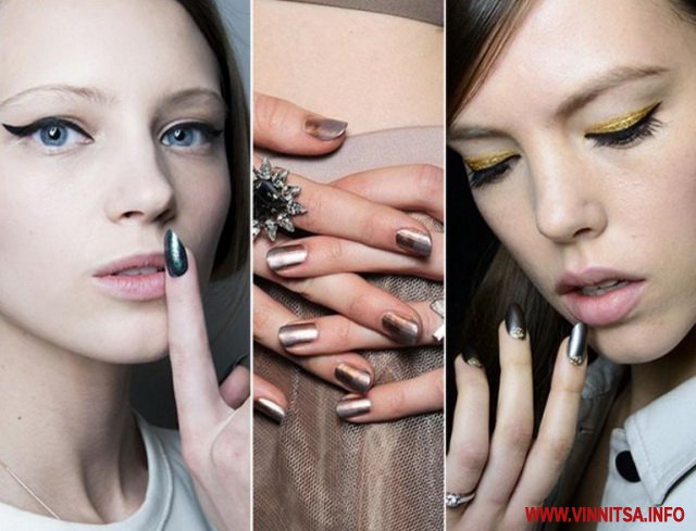 Відтінки металік є "фішкою" наступного 2015 року, вони присутні в одязі, аксесуарах, прикрасах, макіяжі. Хіба міг манікюр залишитися осторонь? Для створення гарних нігтів можна скористатися золотистим або сріблястим напівпрозорим лаком або ж зробити оформлення нігтів за допомогою фольги. Використовуючи металеві відтінки можна зробити класний манікюр френч, місячний манікюр, нанести модні смуги або намалювати малюнок. Популярний також і декор для нігтів.