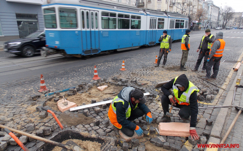 Після обіду 15 листопада, по вулиці Соборна у Вінниці, триває ремонт дороги. Ремонтники перекладають та укріплюють бруківку.