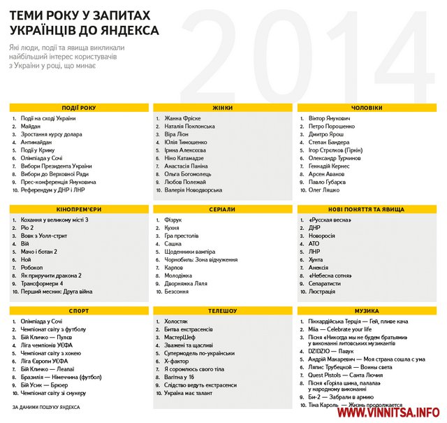 Події року: події на сході України; майдан; зростання курсу долара; анти майдан; події у Криму; олімпіада у Сочі; вибори Президента України; вибори до Верховної Ради; прес-конференція Януковича; референдум у ДНР і ЛНР.