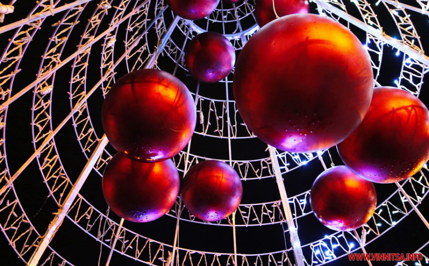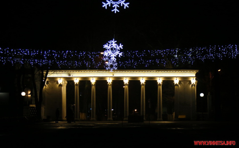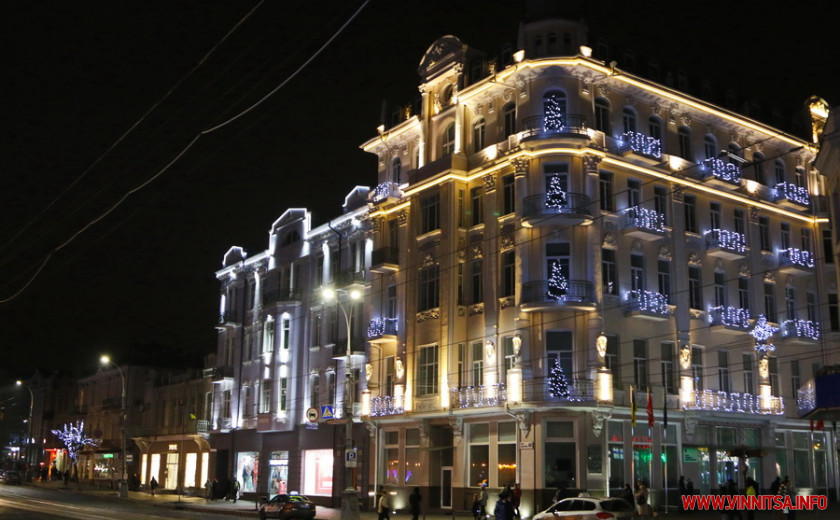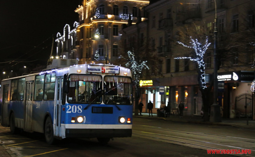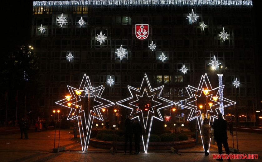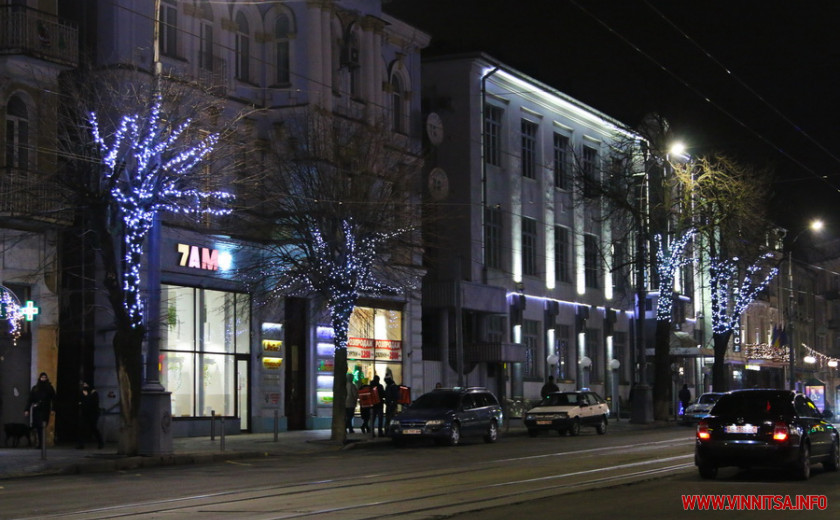 Напередодні новорічних свят центр Вінниці прикрасили у святкову ілюмінацію. Підсвічені фасади будівель, дерева. По Соборній курсує прикрашений у новорічну тематику громадський транспорт.