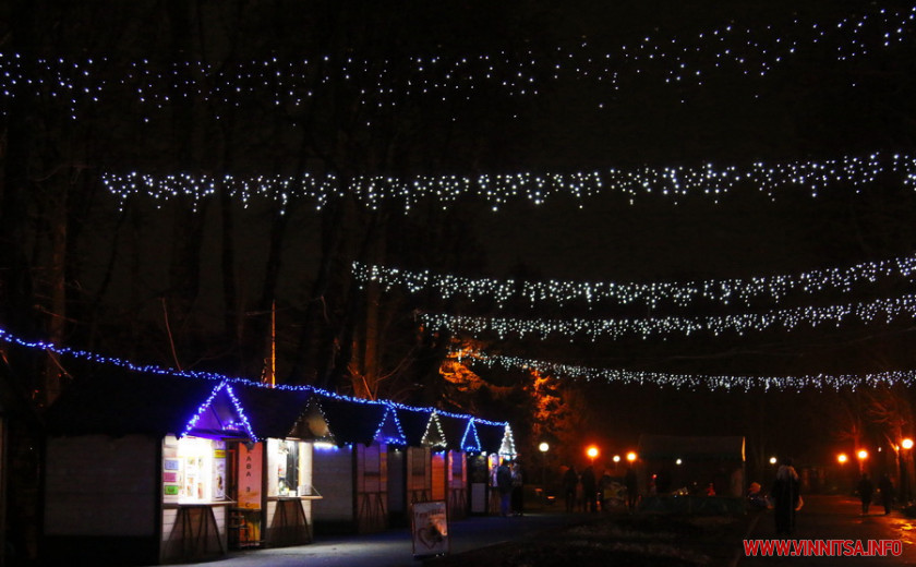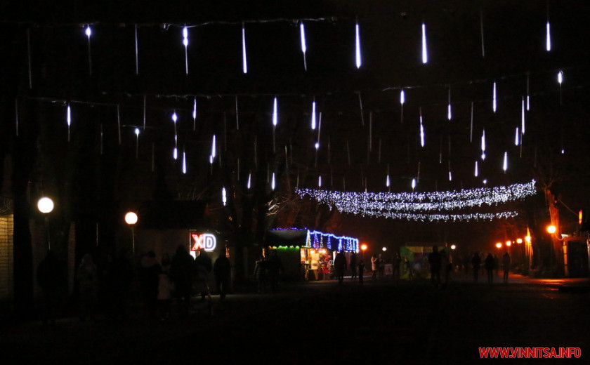 Хоч і в Центральному парку цього року без ялинки, однак там теж святкова атмосфера. Від двох входів – зі сторони вул. Грушевського та вул. Хлібної – висять ілюмінації: дощик та сніжинки.