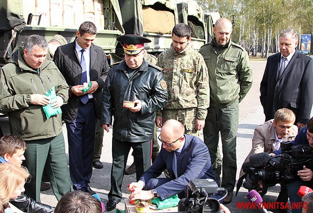 Арсеній Яценюк зазначив, що позитивним є той факт, що екіпірування, техніка, засоби захисту і навіть сухі пайки для бійців виготовляються в Україні. Прем’єр скуштував продукти, що включені до складу сухпайків, та зазначив що вони – хорошої якості.