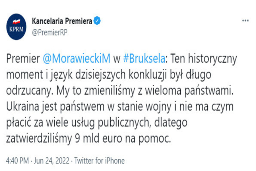 «Цей історичний момент і мова сьогоднішніх висновків довгий час відкидалися. Ми змінили це з багатьма країнами. Україна перебуває в стані війни, і їй нічим платити за багато державних послуг, тому ми схвалили виділення 9 млрд євро на допомогу», — зазначив Матеуш Моравецький.