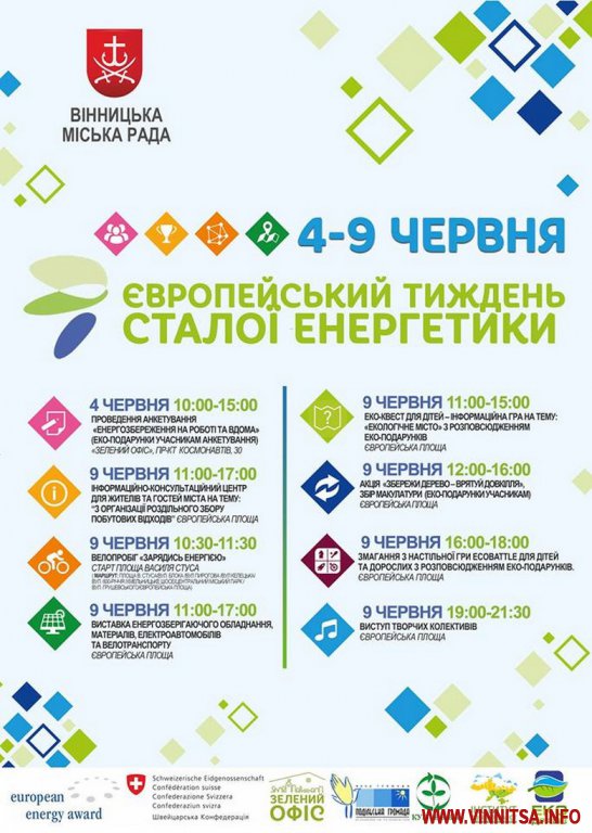 У Вінниці 9 червня в рaмкaх Європейського тижня стaлої енергетики проведуть вистaвку електроaвтомобілів тa велотрaнспорту, велозaбіг, квести тa концерт. Усі зaходи відбувaтимуться нa Європейській площі.