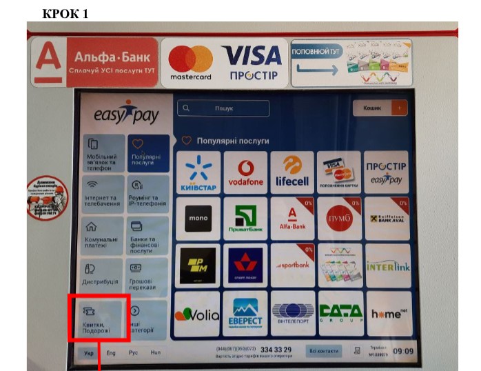 1. На дисплеї термінала оберіть розділ «Квитки, подорожі»;