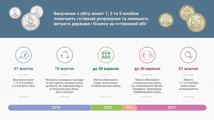 З 1 жовтня монети 1, 2 та 5 копійок перестануть бути платіжним засобом в Україні та будуть вилучені з готівкового обігу. Також з обігу поступово виводитиметься монета номіналом 25 копійок, яка поки залишиться платіжним засобом. Але ті монети номіналом 25 копійок, що потраплятимуть у банки, не повертатимуться назад у обіг і поступово їх ставатиме все менше.