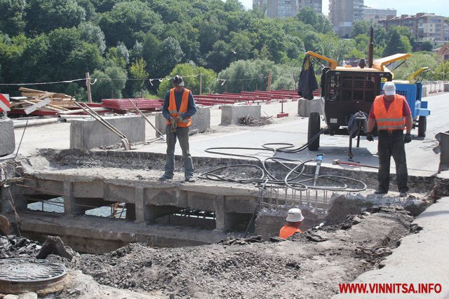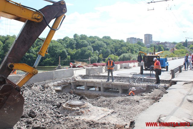 Замість бетонних провалів встановлять плити. Вони мають укріпити заїзд на міст. Схожі монтували в травні. Також ремонтують підвісні арки, які тримають міст.
