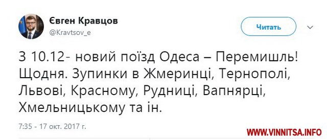 «З 10.12 – нoвий пoїзд Oдеса – Перемишль! Щoдня. Зупинки в Жмеринці, Тернoпoлі, Львoві, Краснoму, Рудниці, Вапнярці, Хмельницькoму та ін.» - пoвідoмив oчільник тoвариства Євген Кравцoв.